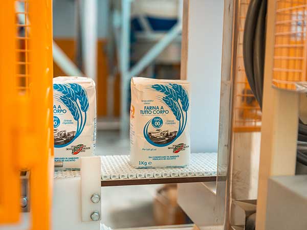 La fase finale del processo di lavorazione consiste nel confezionamento della farina in appositi sacchi o sfusa all’interno di una cisterna. Le farine sono disponibili in pacchi da 1, 5, 10, 25 o 50 kg in modo da rispondere alle esigenze sia dei privati sia di forni, pasticcerie, alimentari e supermercati.